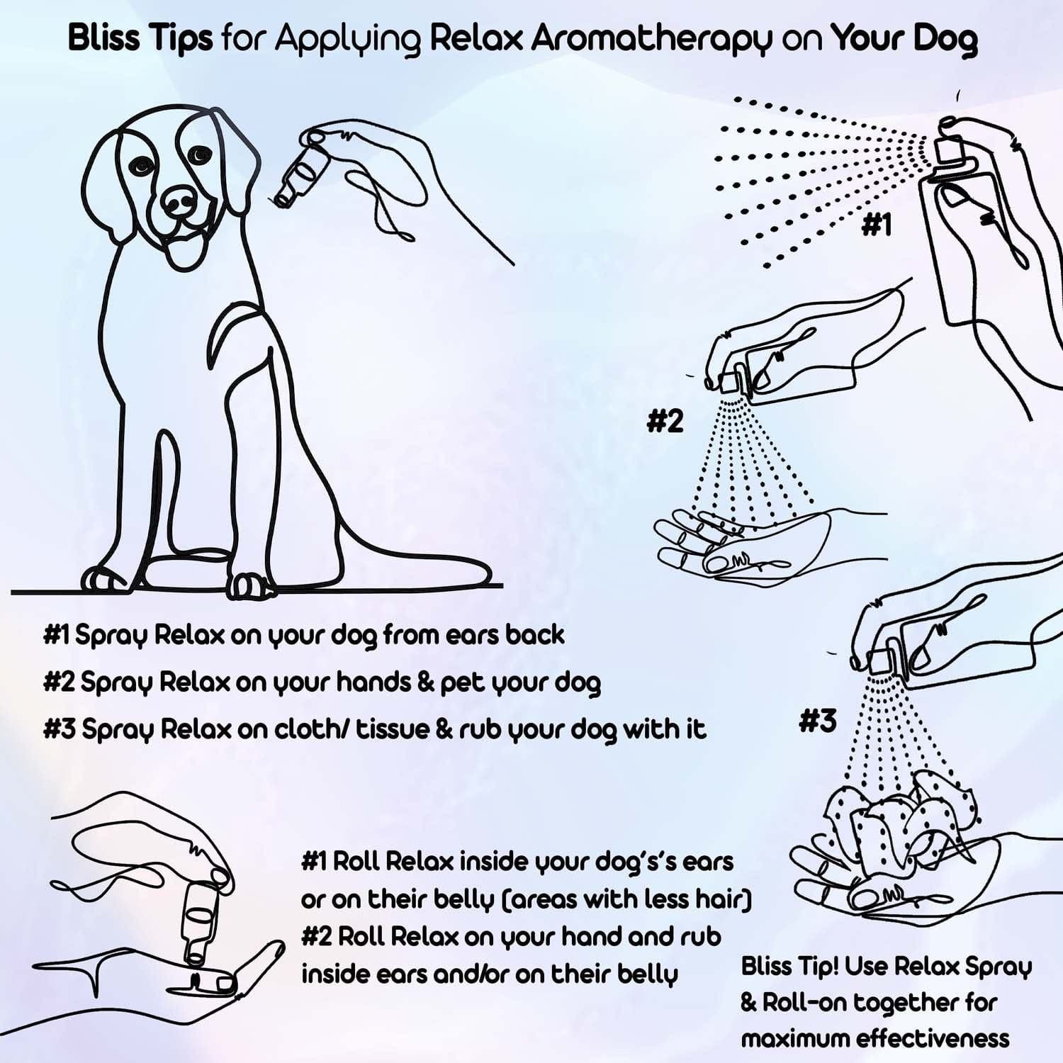 Bliss Tip!You can also spray Relax on your dog's bedding, in their crate, a towel or small blanket or even a stuffed toy.